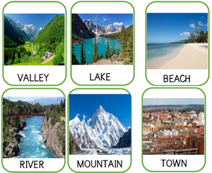 Then, we are review of different concept about places and activities, such us: play, run, ride, ski... (Luego, nosotros vamos a repasar el vocabulario de lugares y actividades, como: jugar, correr, montar en bici, esquiar...)